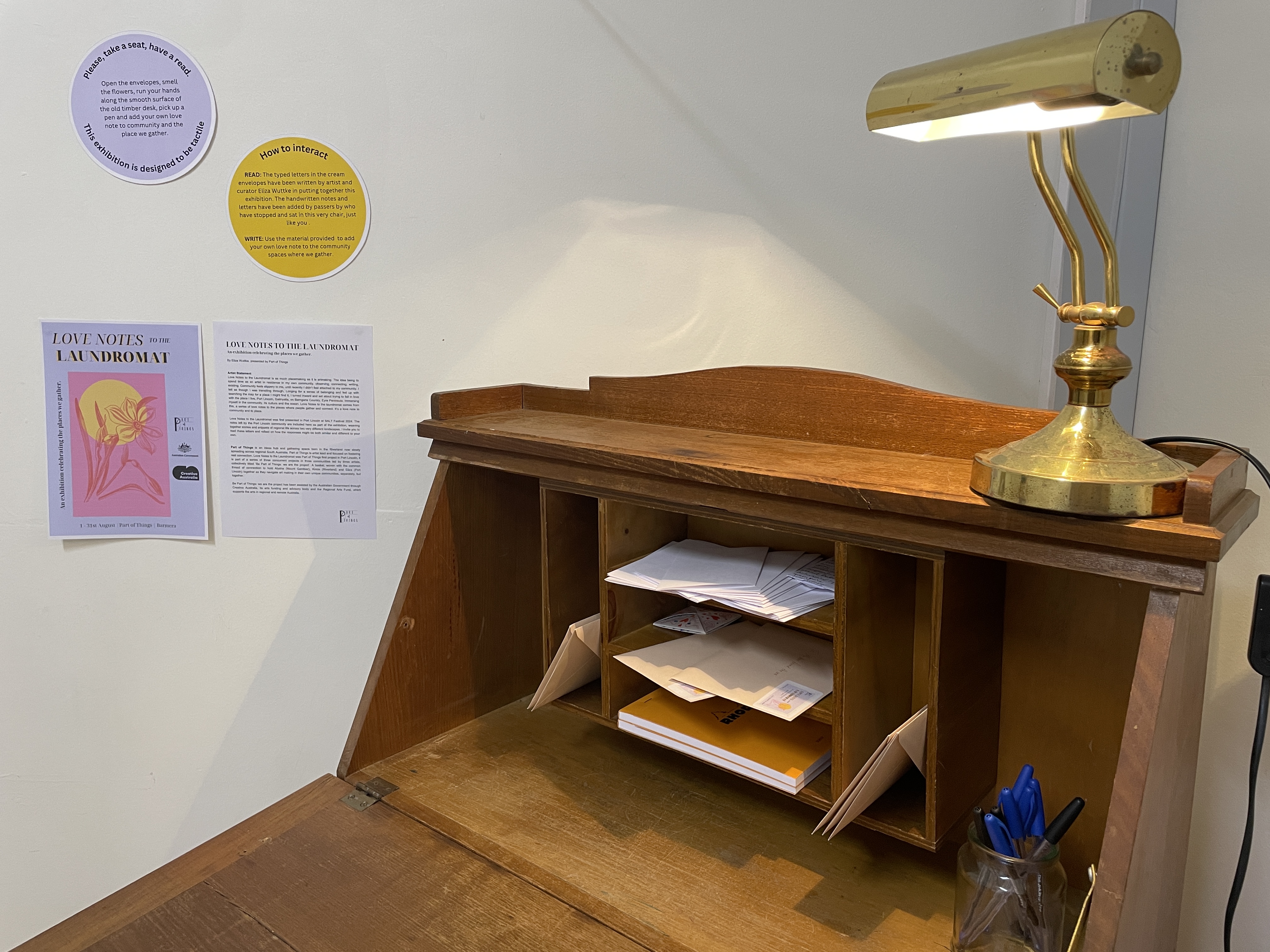 Celebrating the places we gather, Love Notes to the Laundromat is an installation artwork by Port Lincoln artist Eliza Wuttke. Eliza spent time as artist in residence in her community, writing a series of love letters to the places she holds dear. Visitors are invited to take a seat, read through the letters and pen their own.