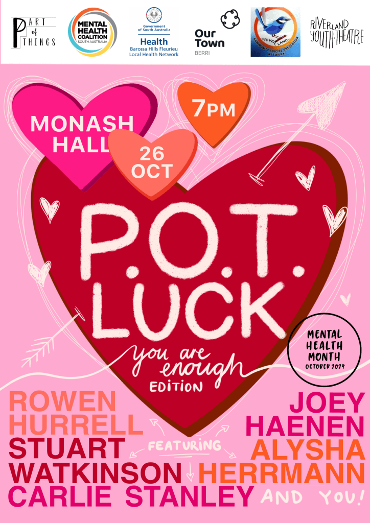 The P.O.T. LUCK: You Are Enough Edition is proudly presented by Part of Things as part of Mental Health Month. This event was made possible with funding from the Mental Health Coalition of SA, Barossa Hills Fleurieu Local Health Network, Our Town Berri, Riverland Community Suicide Prevention Network, and Riverland Youth Theatre.